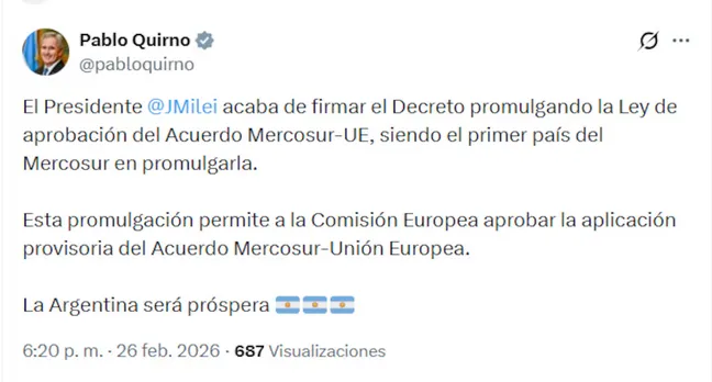Tras aprobarse, el canciller Pablo Quirno confirmó que Javier Milei firmó el decreto que promulga la Ley de aprobación del Acuerdo, siendo el primer país del Mercosur en promulgarla.