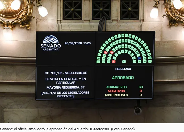 El Senado dio luz verde este jueves al Acuerdo Mercosur-Unión Europea. El tratado se aprobó con 69 votos afirmativos y tres negativos, y la Argentina se convirtió en el segundo país en aceptar el proyecto.