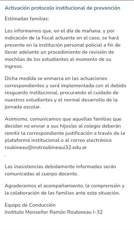 “Les informamos que mañana, por disposición de la Fiscalía interviniente, la Policía de la Provincia de Corrientes llevará adelante en la institución un procedimiento de control preventivo al momento del ingreso de los estudiantes”, dice el comunicado.