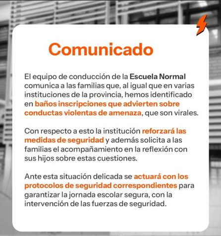 En el comunicado, también se indicó que, ante la situación, se dará intervención a las fuerzas de seguridad, con el objetivo de garantizar el normal desarrollo de las actividades escolares y preservar la seguridad de toda la comunidad educativa”, informaron a El Litoral.