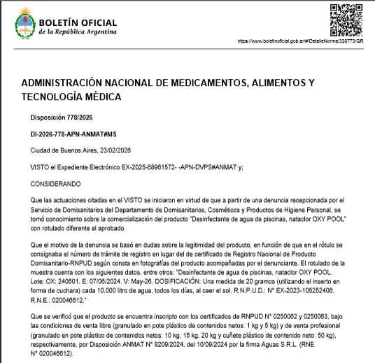 En la primera de ellas la Anmat prohibió "el uso, la comercialización y la distribución en todo el territorio nacional, como así también toda publicidad, del siguiente producto: 'Desinfectante de agua de piscinas, nataclor OXY POOL'. DOSIFICACIÓN: Una medida de 20 gramos (utilizando el inserto en forma de cuchara) cada 10.000 litro de agua, todos los días, al caer el sol. R.N.P.U.D.: N° EX-2023- 105252406. R.N.E.: 020046612. Contiene: 90% Dicloro isocianurato de sodio. 10% Oxígeno activo".
