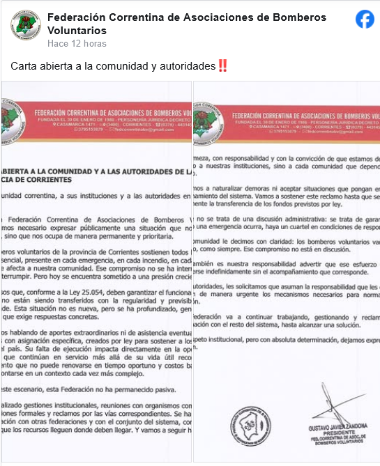 A través de un duro documento público, la Federación Correntina de Asociaciones de Bomberos Voluntarios manifestó su "profunda preocupación" ante la falta de regularidad en la transferencia de recursos nacionales. Según la entidad, la situación está empujando al sistema provincial a un escenario de presión creciente que afecta directamente la operatividad de los cuarteles.