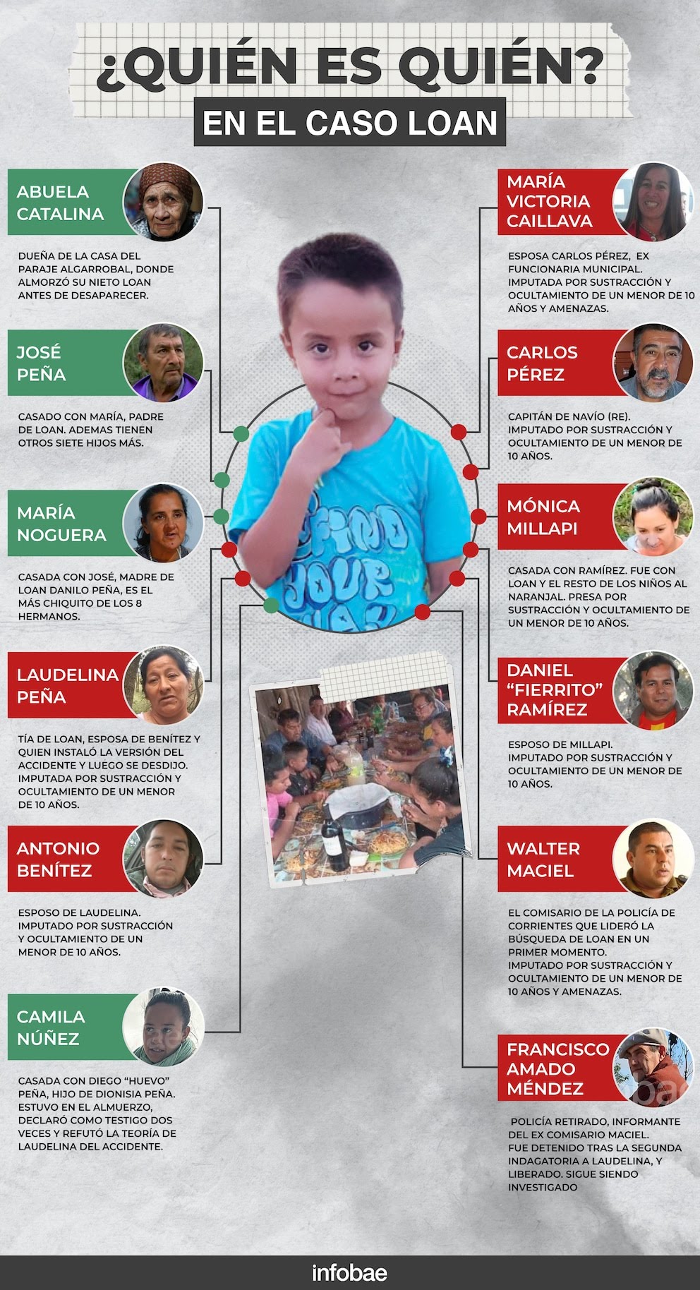 Los 10 imputados por la causa paralela son: Nicolás Gabriel Soria, alias “El Americano” o “El Yanqui”, Elizabeth Cutaia, Pablo Noguera, Leonardo Rubio, Alan Cañete, Delfina Taborda, Verónica Machuca Yuni, Valeria López, Pablo Núñez y Federico Rossi Colombo. Y se los acusa por haber retenido a los menores que estuvieron con Loan en el naranjal el día de su desaparición y por haber manipulado sus declaraciones para entorpecer la investigación, además de defraudar a la administración pública.