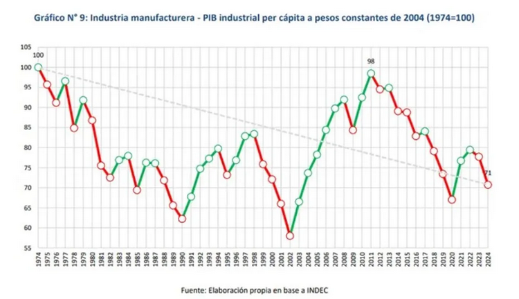 Uno de los datos más llamativos del estudio es la caída del peso del sector industrial dentro de la economía argentina. Según el trabajo, la participación de la industria en el PBI bajó del 16,5% en 2023 al 13,7% en 2025, un nivel que —según los investigadores— remite a valores anteriores a la Segunda Guerra Mundial.