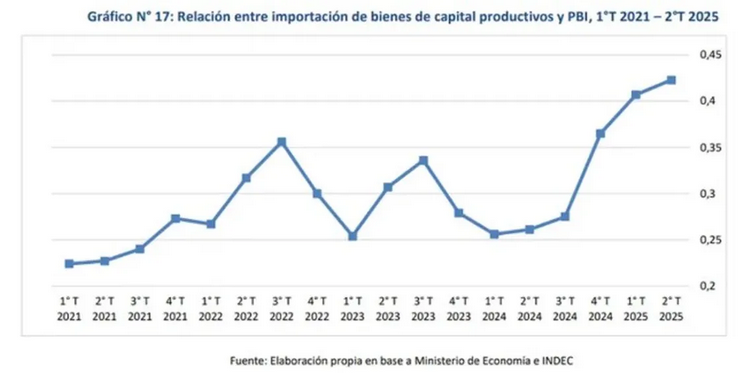 8. Alarma, el sector de bienes de capital en jaque. Entre 2023 y 2025 la producción local cayó casi 25%, mientras las importaciones de bienes de capital se dispararon al 77%.