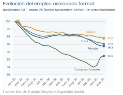 Según un informe elaborado por la Universidad de Buenos Aires, el empleo asalariado formal total lleva nueve meses de caídas consecutivas, mientras que en el empleo asalariado formal del sector privado son ocho los meses los que marca un retroceso. Esto implica una pérdida de 206.000 puestos desde noviembre de 2023.El trabajo, titulado “Panorama del empleo asalariado formal y de las remuneraciones”, fue coordinado por Roxana Maurizio y Luis Beccaria en el marco del Área de Empleo, Distribución e Instituciones Laborales (EDIL), dependiente del Instituto Interdisciplinario de Economía Política (IIEP) de la Facultad de Ciencias Económicas.El empleo asalariado formal total en enero de 2026 representaba una pérdida de 121 mil puestos de trabajo (-1,2%) respecto de enero de 2025 y de 304 mil puestos de trabajo (-3,0%) respecto de noviembre de 2023.