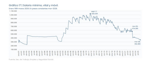 salario mínimo en términos reales de marzo de 2026 se ubique en un valor inferior al de 2001, antesdel colapso de la convertibilidad. Asimismo, implica una erosión del 66% respecto del valor máximo de la serie, en septiembre de 2011, de forma tal que representa apenas un tercio del mismo.