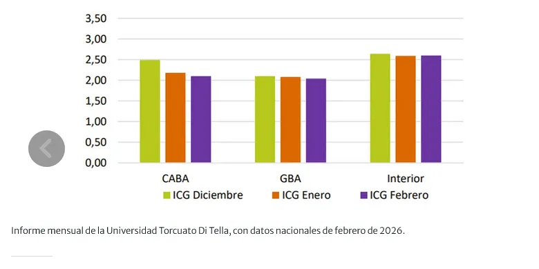 El estudio se basa en una encuesta de alcance nacional y utiliza una escala que va de 0 a 5 puntos. En febrero, el ICG se ubicó en 2,38 puntos, un valor cercano al promedio de la gestión de Javier Milei, que ronda los 2,44 puntos. Según la casa de estudios, el comportamiento del índice se mantiene dentro de un rango acotado, sin desvíos pronunciados.