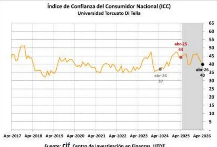 El Índice de Confianza del Consumidor (ICC) registró una nueva baja en abril, según la Universidad Di Tella, y profundiza la tendencia negativa iniciada a comienzos de 2026.