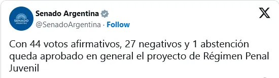 La iniciativa fue aprobada por 44 votos a favor, 27 en contra y una abstención. De esta manera sancionó con fuerza de Ley el proyecto que había sido aprobado la semana pasada en la Cámara de Diputados.