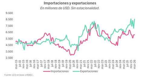 LCG estimó un superávit comercial similar para este año, por encima de los u$s10.000 millones, teniendo en cuenta la cosecha récord de maíz, el reciente aumento en el precio del petróleo por la guerra en Medio Oriente y la dinámica de una actividad económica que, por el momento, no da señales de un repunte considerable.