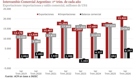 Hacia adelante, ACM pronosticó que las exportaciones superarán los u$s90.000 millones en 2026 (en el primer trimestre rozaron los u$s22.000 millones), traccionadas principalmente por el complejo agroindustrial y un aporte creciente del sector energético. En cuanto a las importaciones, las ven aumentando a un menor ritmo que en 2025, para culminar el año en torno a los u$s80.000 millones (en el primer trimestre se ubicaron arriba de los u$s16.000 millones). "Resta ver en qué medida la recuperación de importaciones se concentra en bienes de capital e insumos (más que en consumo) y si se sostiene la competitividad necesaria para que el superávit proyectado se materialice", profundizó la entidad.