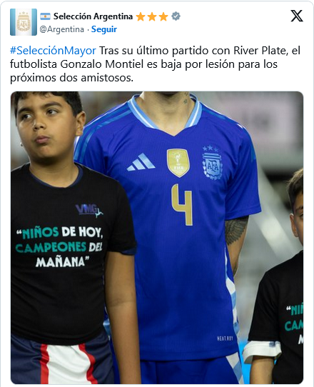 El futbolista sufrió una lesión de grado uno en el bíceps femoral de la pierna izquierda, lo que le impedirá disputar los amistosos de la fecha FIFA. “Tras su último partido con River Plate, el futbolista Gonzalo Montiel es baja por lesión para los próximos dos amistosos”, informó la cuenta oficial del seleccionado nacional.