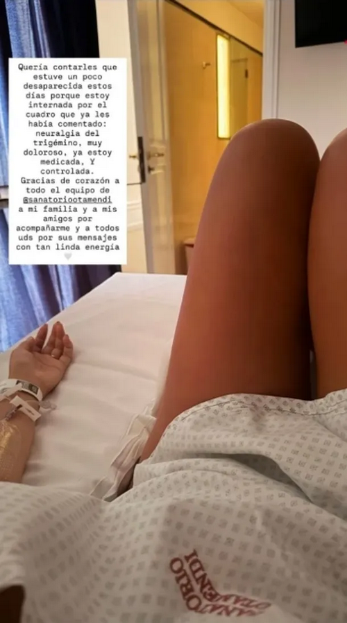 “Quería contarles que estuve un poco desaparecida estos días porque estoy internada por el cuadro que ya les había comentado: neuralgia del trigémino, muy doloroso”, expresó la modelo en su primer posteo desde el centro de salud.