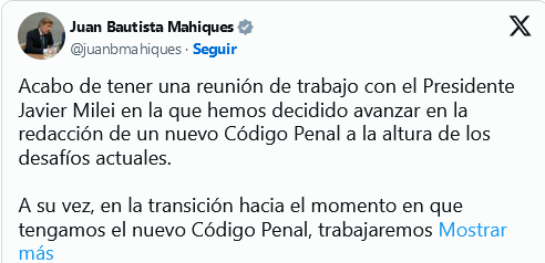 El Gobierno volvió a poner sobre la mesa la reforma del Código Penal. A través de un mensaje publicado en X, el ministro de Justicia, Juan Bautista Mahiques, informó este martes que mantuvo una reunión de trabajo con el presidente Javier Milei y aseguró que ambos decidieron avanzar en la redacción de una nueva norma “a la altura de los desafíos actuales”.