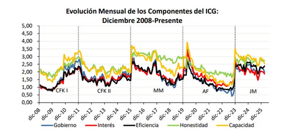 A nivel de componentes, el retroceso fue generalizado: cuatro de los cinco subíndices mostraron caídas. Honestidad se mantuvo como el valor más alto (2,73 puntos), seguido por Capacidad (2,55), mientras que Eficiencia fue el único indicador que creció, con 2,38 puntos.