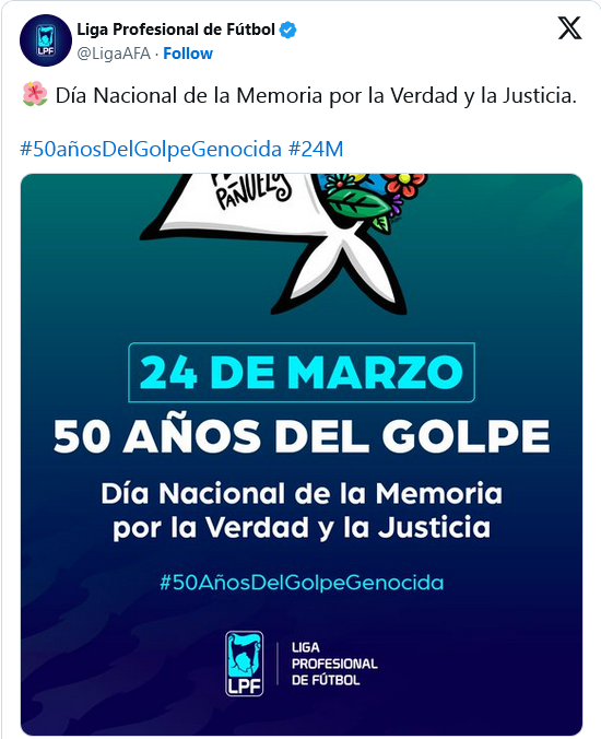 En este 24 de marzo, Día de la Memoria por la Verdad y la Justicia, varios clubes del fútbol argentino se manifestaron en sus redes sociales con mensajes conmemorativos por el 50° aniversario del golpe de Estado de 1976. Las publicaciones comenzaron a aparecer apenas pasada la medianoche, con placas y videos alusivos a la fecha.