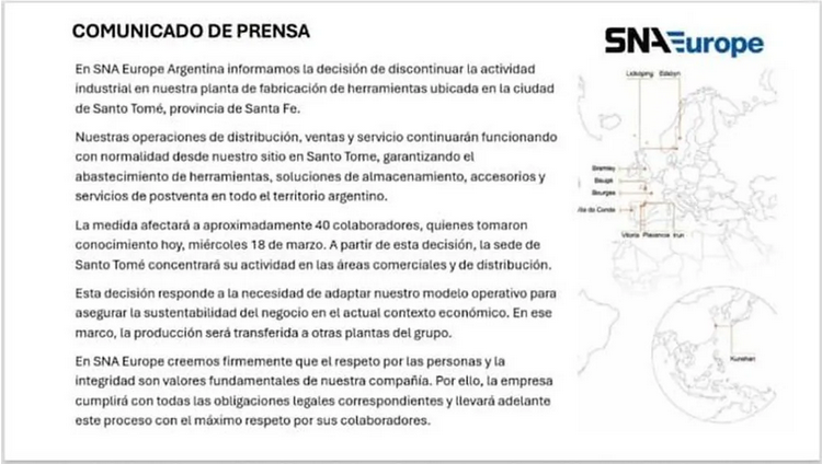 “En SNA Europe creemos firmemente que el respeto por las personas y la integridad son valores fundamentales. Por ello, la empresa cumplirá con todas las obligaciones legales correspondientes y llevará adelante este proceso con el máximo respeto por sus colaboradores”, cerró el comunicado.