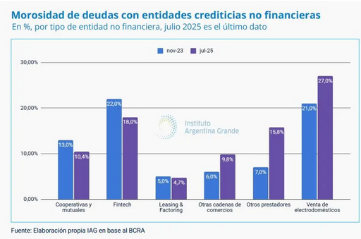 El estrés financiero golpea más a los eslabones más vulnerables del entramado social y comercial. Según un cruce de datos del Instituto Argentina Grande (IAG), el decil de menores deudas (hogares que deben entre $25.000 y $123.000) registra un nivel de morosidad del 27,9%, evidenciando que los sectores de ingresos más bajos que se endeudaron para el consumo diario directamente dejaron de pagar.