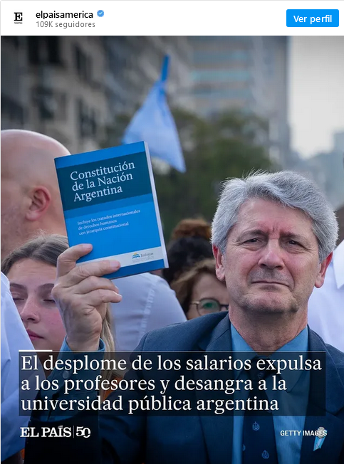 El desplome de los salarios expulsa a los profesores y desangra a la universidad pública argentina , titula El País el artículo en el que da cuenta del recorte presupuestario y la licuación de los haberes frente a la inflación.