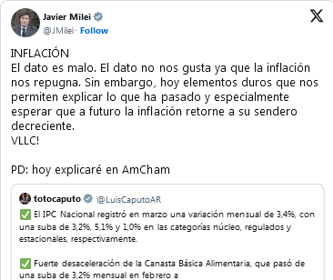 El mandatario adelantó en su cuenta de la red social X que el 3,4% de inflación registrado en marzo “Es un mal dato” y adelantó que iba a explicarlo durante esta reunión.