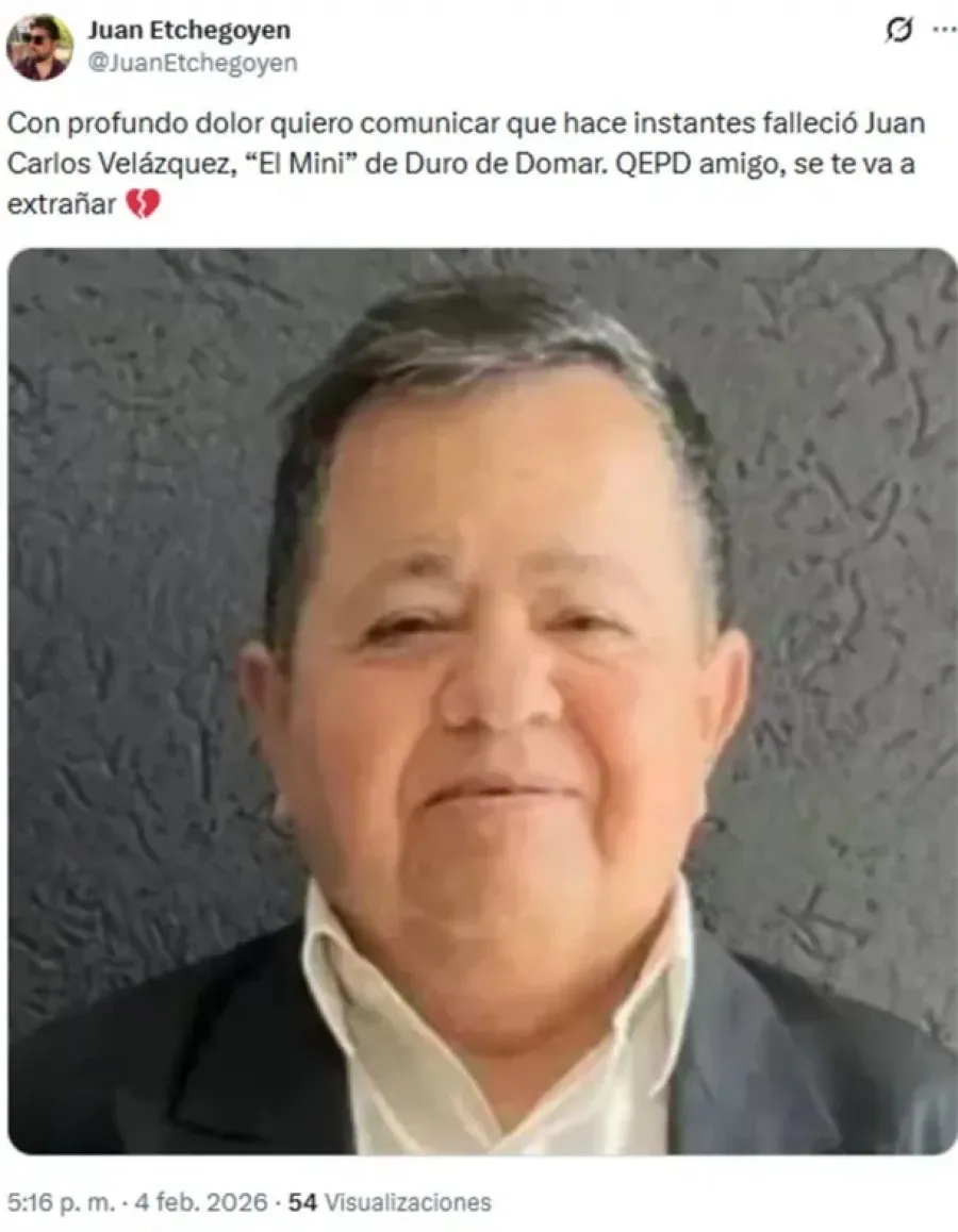La televisión argentina atraviesa horas de profundo dolor tras conocerse el fallecimiento de Juan Carlos Velázquez, el actor y humorista que alcanzó gran popularidad como “El Mini” de Duro de Domar. El artista murió este miércoles a los 64 años, según confirmaron sus familiares.La noticia fue dada a conocer este miércoles. “Con profundo dolor quiero comunicar que hace instantes falleció Juan Carlos Velázquez, ‘El Mini’ de Duro de Domar. QEPD amigo, se te va a extrañar”, escribió el periodista Juan Etchegoyen en su cuenta de X, generando una inmediata ola de mensajes de despedida.