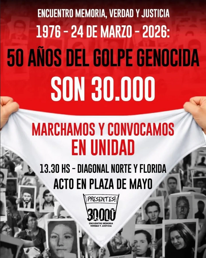 La conducción de la CGT convocó a sumarse a la marcha a las 14 en Diagonal Sur y Bolívar. “A 50 años del Golpe cívico-militar, marchamos. Este 24 de marzo volvemos a las calles por Memoria, Verdad y Justicia.