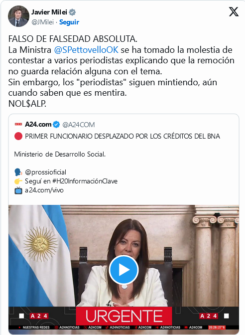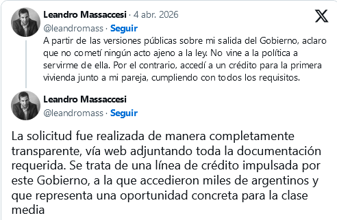 El Presidente salió el sábado de gloria a desmentir que Massaccesi hubiera renunciado por el crédito recibido del Banco Nación pero fue el mismo funcionario saliente de Capital Humano quien desacreditó no sólo la versión de Sandra Pettovello sino también la de Milei. "A partir de las versiones públicas sobre mi salida del Gobierno, aclaro que no cometí ningún acto ajeno a la ley. No vine a la política a servirme de ella. Por el contrario, accedí a un crédito para la primera vivienda junto a mi pareja, cumpliendo con todos los requisitos. La solicitud fue realizada de manera completamente transparente, vía web adjuntando toda la documentación requerida. Se trata de una línea de crédito impulsada por este Gobierno, a la que accedieron miles de argentinos y que representa una oportunidad concreta para la clase media", fue la explicación pública del ahora ex jefe de gabinete de Capital Humano que dejó en claro que su salida del Ministerio fue por haber resultado beneficiado con un crédito de $420 millones.