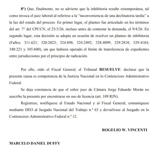El tribunal confirmó la competencia del Juzgado Nacional en lo Contencioso Administrativo Federal Nº 12, que había aceptado la inhibitoria promovida por el Estado Nacional, y ordenó que allí continúe la discusión de fondo sobre la validez de la norma cuestionada por la Confederación General del Trabajo (CGT).