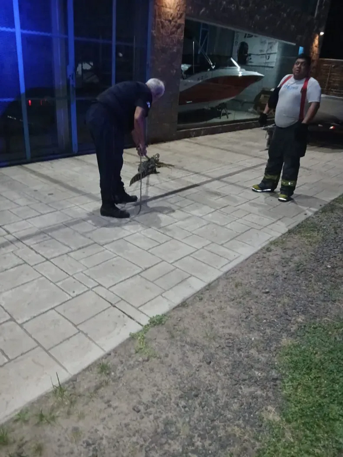En la madrugada del jueves 26 de febrero, a las 04:07 horas, personal de guardia fue alertado a través del sistema 911 sobre la presencia de un yacaré en la vereda de uno de los locales del centro comercial ubicado en la intersección de Ruta 12 y Ruta 43, en el acceso a Santa Ana.