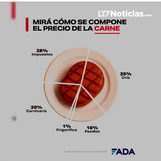 En el caso de la carne, FADA detalló que el 51% del valor final son costos de producción, el 28% impuestos y el 21% ganancias. Dentro de la cadena, la cría representa el 35%, el feedlot el 16%, el frigorífico el 1% y la carnicería el 20%.