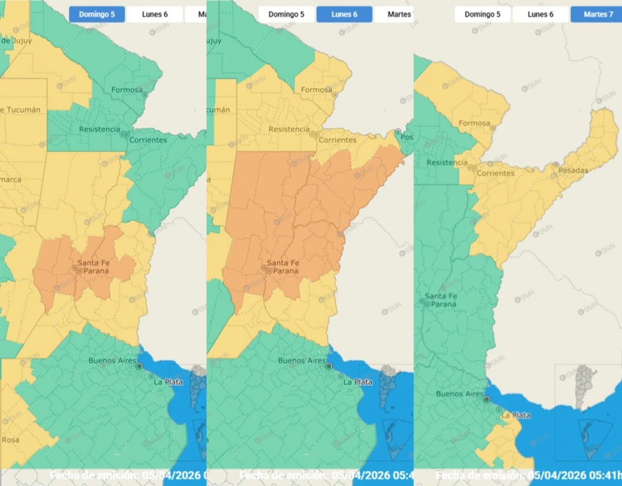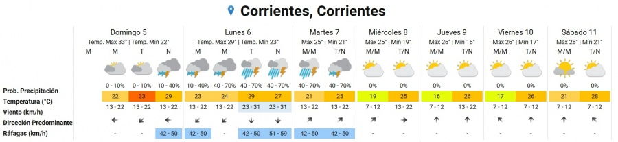 En cuanto a las temperaturas, se anuncian mínimas en descenso que van de 23º, 21º, 19º y 16º hasta el jueves y máximas que no superarán los 26 grados. Las alertas emitidas hablan de probables precipitaciones con tormentas fuertes entre lunes y martes, especialmente con alta intensidad en el interior de Corrientes.