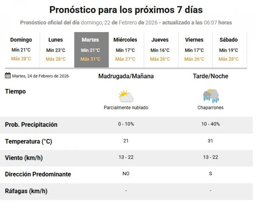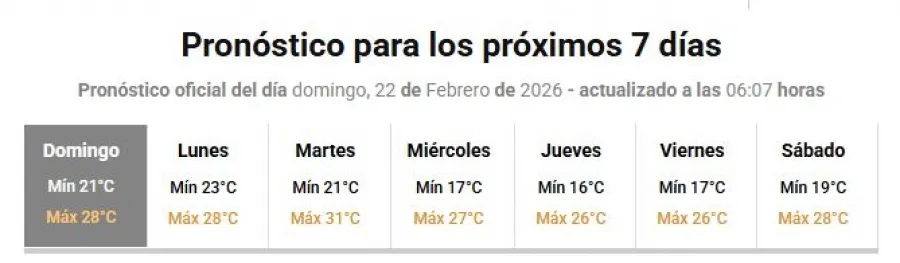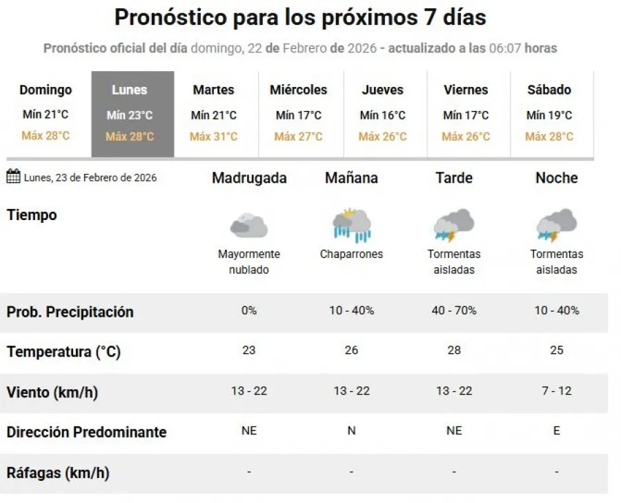 Para el lunes 23 de febrero se esperan valores que oscilarán entre los 28°C de máxima y los 23°C de mínima. Durante la tarde y la noche podrían registrarse tormentas aisladas.