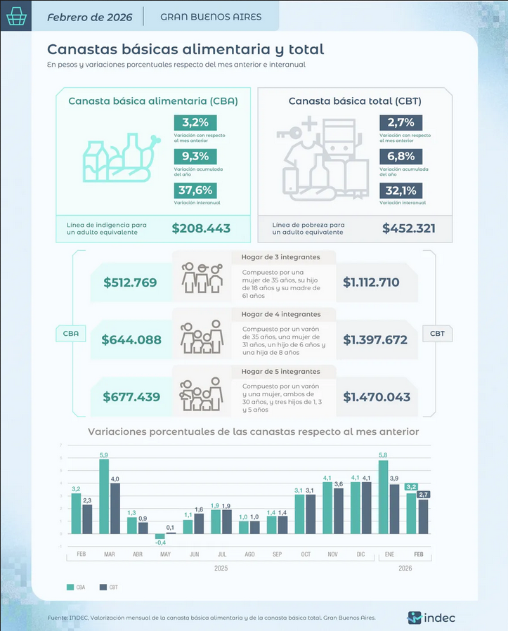 Un hogar, compuesto por dos mayore sy dos niños de seis y ocho años, necesitó en febero de $1.397.671,83 para comprar los bienes y servicios que integran la Canasta Básica Total (CBT) y superar el umbral de pobreza, lo que representó un 2,7% más que en enero y 32,1% ique en febrero del año pasado, informó este jueves el Instituto Nacional de Estadísticas y Censos (Indec).La suba fue levemente menor a la inflación, que se mantuvo en 2,9%, y en la merma influyó el menor aumento en frutas y verduras, que suelen tener un alto componente estacional, y que durante en enero habían subido 5,2%.