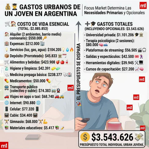 Un reciente informe elaborado por la consultora Focus Market determinó que las necesidades primarias de una persona joven en el entorno urbano alcanzan la suma de $2.085.853 mensuales. A continuación, el detalle exacto de cada uno de los consumos básicos: