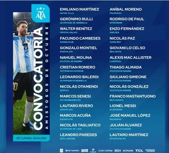 En contrapartida, no fueron citados Exequiel Palacios ni Paulo Dybala. El volante del Bayer Leverkusen arrastra molestias físicas y el delantero de Roma sigue en recuperación.