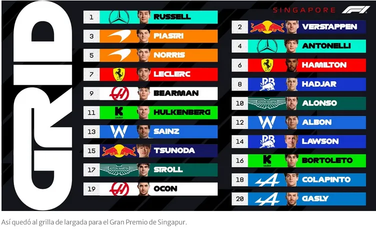 La pole position quedó en poder del británico George Russell (Mercedes), con un tiempo de 1:29,158. El neerlandés Max Verstappen (Red Bull) largará segundo, mientras que el líder del campeonato, el australiano Oscar Piastri (McLaren), comenzará en el tercer lugar.