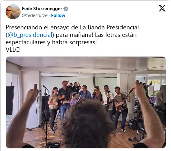 A través de su cuenta de X, el mandatario citó un posteo del ministro de Desregulación y Transformación del Estado, Federico Sturzenegger, quien presenció el ensayo: “VENÍ PROBÁ LA BANDA… VLLC!”, sentenció junto a una imagen en la que se lo ve rodeado de funcionarios y legisladores que lo acompañarán en el escenario.