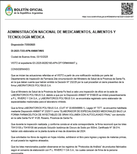 “Inhíbanse preventivamente las actividades productivas de la firma Laboratorios Polybius, de la calle Santa Fe 4126, Rosario, provincia de Santa Fe”, estableció la Anmat que advirtió que el laboratorio se encontraba habilitado como "elaborador de especialidades medicinales bajo al forma farmacéutica de inyectables de gran volumen con autoclavado final".