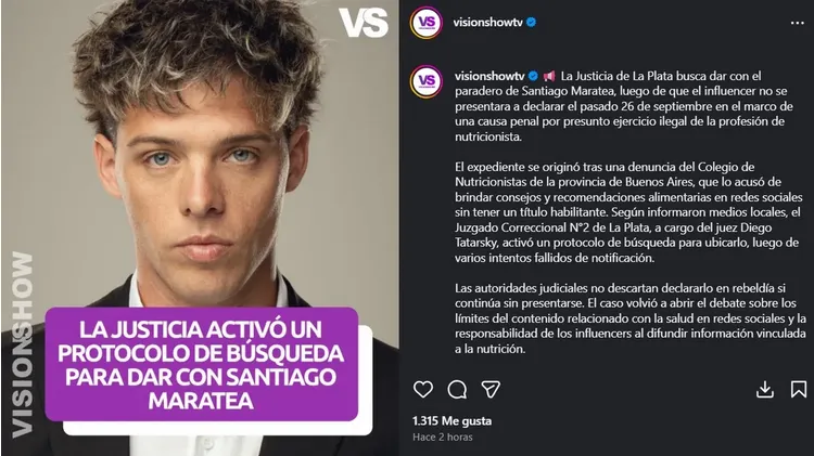 La Justicia de La Plata busca dar con el paradero de Santiago Maratea, luego de que el influencer no se presentara a declarar el pasado 26 de septiembre en el marco de una causa penal por presunto ejercicio ilegal de la profesión de nutricionista. El exconductor de Trata hecho, programa que duró poco más de 1 mes en las noches de América, ahora estaría "acorralado" por la ley.El expediente se originó tras una denuncia del Colegio de Nutricionistas de la provincia de Buenos Aires, que lo acusó de brindar consejos y recomendaciones alimentarias en redes sociales sin tener un título habilitante. Según informaron medios locales, el Juzgado Correccional N°2 de la capital de Buenos Aires, a cargo del juez Diego Tatarsky, activó un protocolo de búsqueda para ubicarlo, luego de varios intentos fallidos de notificación.