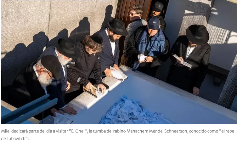 Tras su exposición, Milei se trasladó al barrio Queens para visitar el Ohel, donde descansan los restos del rabino Menachem Mendel Schneerson, conocido como el Rebe de Lubavitch, figura central del movimiento Jabad. El presidente tiende a visitar ese sitio, cada vez que viaja a la ciudad. Allí, en julio de 2023, había pedido la bendición para ser presidente y regresó después de su triunfo para agradecer.