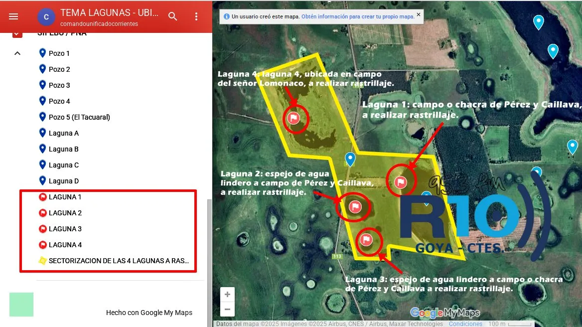 En dicho informe se identificaron cuatro lagunas en el entorno de la propiedad rural del matrimonio Pérez y Caillava, con sus respectivas coordenadas geográficas: