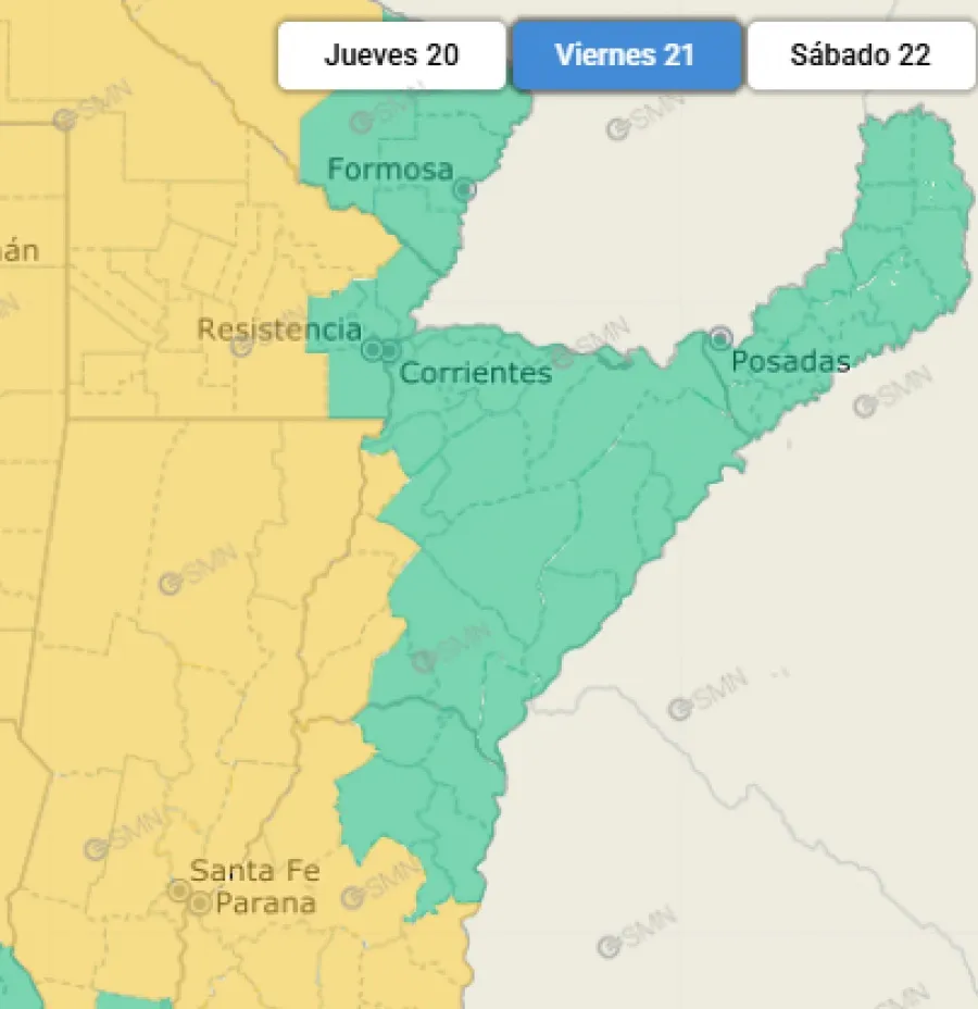 El mapa oficial muestra que algunas localidades del sudoeste y oeste de la provincia estarán bajo alerta amarilla este viernes. Durante dicha jornada, el SMN anticipa la formación y desarrollo de tormentas desde la mañana, con mayor actividad durante la mañana y la tarde. Las probabilidades de precipitación se ubican entre 40% y 70% en los momentos de mayor intensidad.
