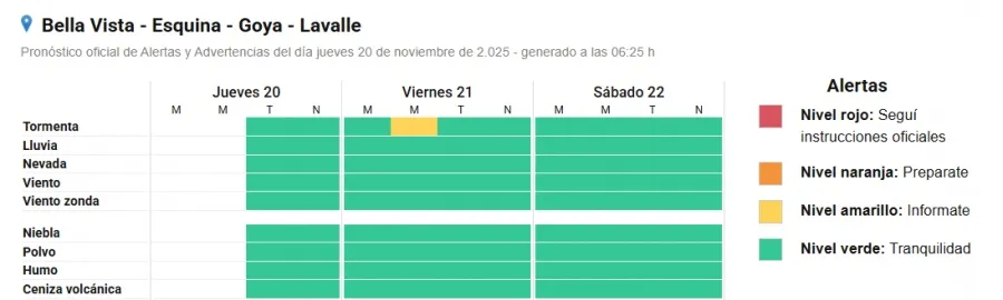 El reporte indica que las localidades afectadas serán: Bella Vista - Esquina - Goya - Lavalle.